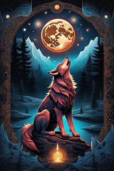 在月亮牌中,一輪明亮的月亮高懸在夜空中,代表著情感和直覺的象徵。月亮的光芒照亮了一條通往水域的小徑,象徵著探索內在世界的旅程。在小徑的盡頭,有一隻狐狸和一隻狼站在水邊,象徵著我們內在的野性和直覺力。此外,還有一個月亮形狀的面具浮在水中,代表著錯覺和虛幻。
